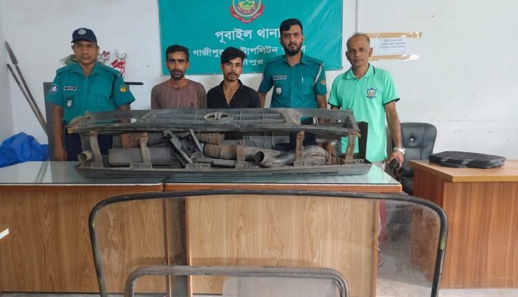 গাজীপুর মহানগরীর পূবাইলে একটি কাভার্ডভ্যান চুরি হওয়া গাড়িটির যন্ত্রাংশ উদ্ধার করতে সক্ষম হয়েছে পূবাইল থানা পুলিশ।এ সময় গাড়ি চুরির সঙ্গে জড়িত দুই চোরকে গ্রেফতার করেছে পুলিশ। রবিবার ভোরে জামালপুর জেলার জামালপুর সদর থানাধীন শান্তিনগর সাকিনস্থ জাবেদ ফিলিং স্টেশন এর পূর্ব পাশে সোহেল অটো মোবাইল এর ভিতর হতে কাভার্ডভ্যানটির যন্ত্রাংশ উদ্ধার করে। গ্রেফতাররা হলেন শেরপুর জেলার শ্রীবর্দী থানার টাংগারপাড়া (মটকি বাড়ী) এলাকার মোঃ নাজুর ছেলে সোহেল (৩০) ও মোঃ শফিকুল ইসলাম সোহেল (৩৬) তাদের বিরুদ্ধে পূবাইল থানায় একটি মামলা দায়ের করে।