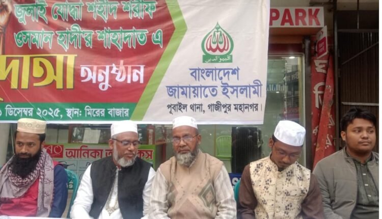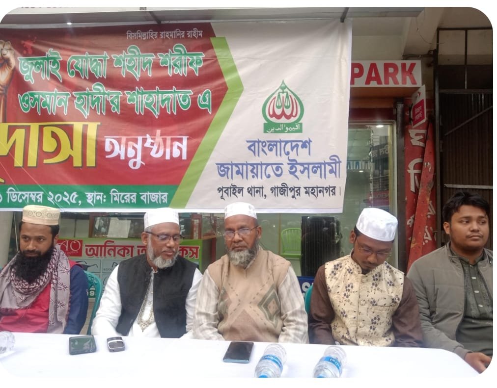 গাজীপুর মহানগরের পূবাইল থানাধীন মিরের বাজারের জহির উদ্দিন মার্কেটে বাংলাদেশ জামায়াতে ইসলামী পূবাইল থানা শাখার উদ্যোগে ইনকিলাব মঞ্চ’-এর মুখপাত্র শরীফ ওসমান হাদির মৃত্যুতে রুহের মাগফেরাত কামনায় আলোচনা ও দোয়া মাহফিল রবিবার বিকালে অনুষ্ঠিত হয়েছে। আলোচনা ও দোয়া মাহফিলে উপস্থিত ছিলেন, প্রধান আলোচক হিসেবে উপস্থিত ছিলেন,বাংলাদেশ জামায়াতে ইসলামীর কেন্দ্রীয় মজলিসে শুরা সদস্য গাজীপুর মহানগর নায়েবে আমির গাজীপুর ৫আসনের সংসদ সদস্য পদপ্রার্থী খায়রুল হাসান, আলোচক হিসেবে আরও উপস্থিত ছিলেন,পূবাইল থানা জামায়াতে ইসলামীর,আমীর আশরাফ আলী কাজল , জামায়াতে ইসলামীর পূবাইল থানার সাধারণ সম্পাদক হারুনুর রশিদ,পূবাইল থানা ছাএ শিবিরের সভাপতি, ইকবাল মাহমুদ,পূবাইল থানা ছাএ শিবিরের সাধারণ সম্পাদক মাহাদী হাসান প্রমুখ,