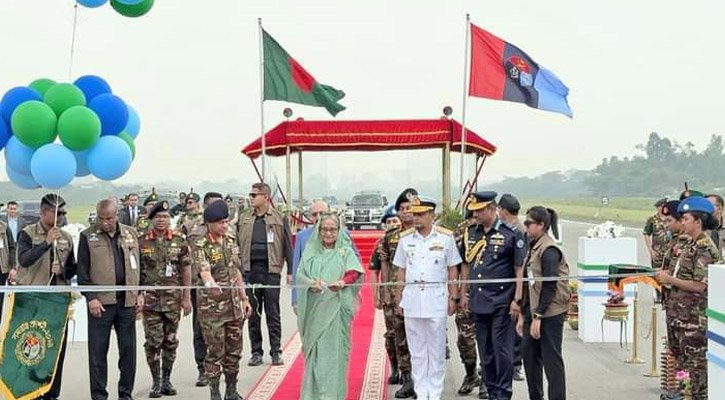 ফিতা কেটে বেলুন উড়িয়ে সমরাস্ত্র প্রদর্শনীর উদ্বোধন করেন প্রধানমন্ত্রী।
