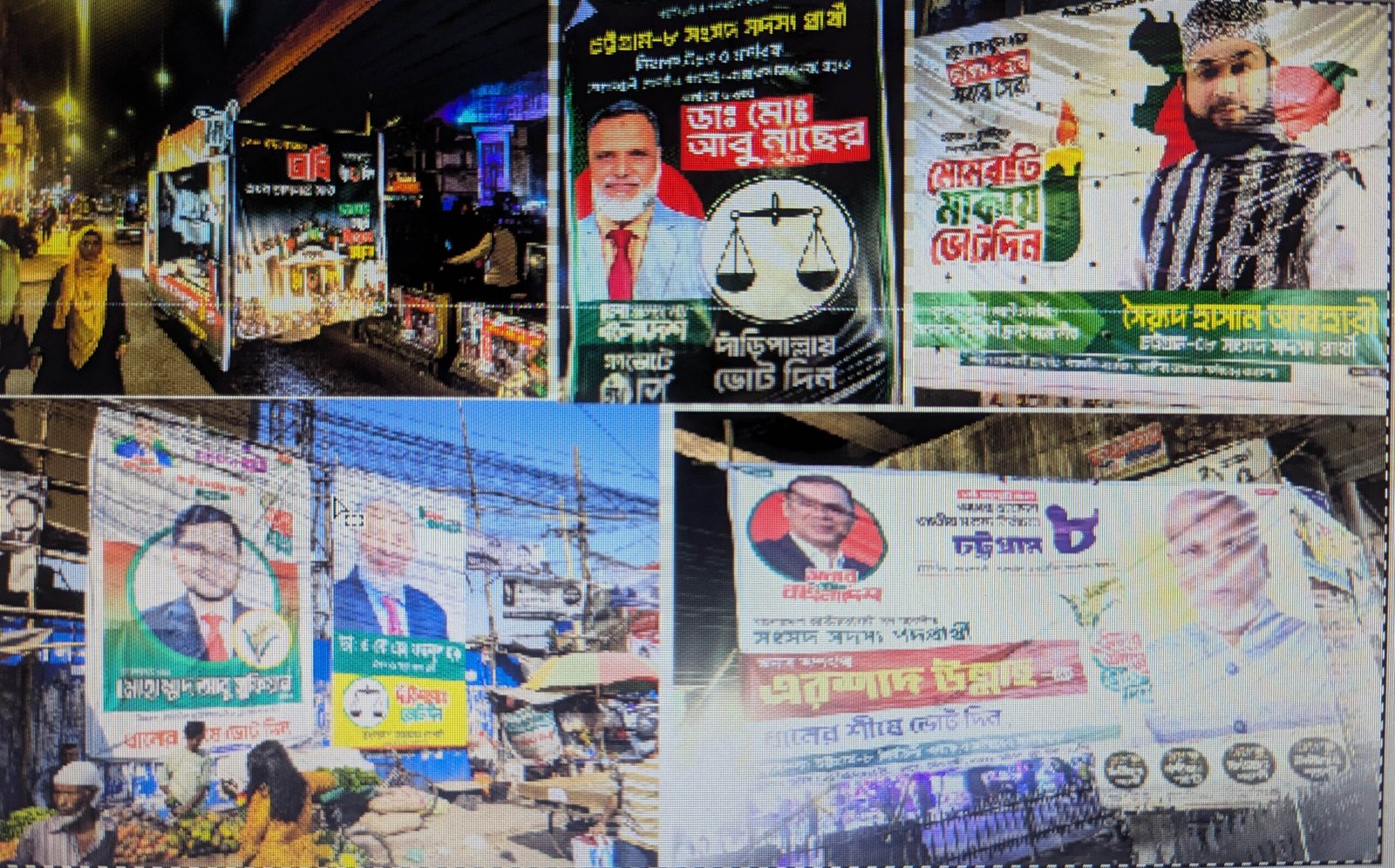 সরেজমিনে দেখা গেছে, চট্টগ্রাম-৮ (বোয়ালখালী ও নগরীর একাংশ) আসনের বিভিন্ন গুরুত্বপূর্ণ মোড়ে সাঁটানো হয়েছে বিশাল আকারের রঙিন ব্যানার। বিশেষ করে বহদ্দারহাট মোড়ে উড়াল সড়কের নিচে একসঙ্গে দেখা গেছে জামায়াতে ইসলামীর প্রার্থী ডা. আবু নাছের (দাঁড়িপাল্লা), বিএনপির প্রার্থী এরশাদ উল্লাহ (ধানের শীষ) ও ইসলামী ফ্রন্টের প্রার্থী সৈয়দ মুহাম্মদ হাসানের (মোমবাতি) রঙিন ব্যানার। ১১ দলীয় নির্বাচনী ঐক্যের মনোনীত এনসিপি প্রার্থী জোবাইরুল হাসান আরিফের বড় ব্যানার সরাসরি চোখে না পড়লেও, রঙিন ব্যানারে মোড়ানো গাড়িতে করে ‘হ্যাঁ’ ভোটের প্রচারণা, শাপলা কলির প্রতীক ব্যবহার এবং উচ্চ শব্দে মাইকিং করতেও দেখা গেছে, যা আচরণবিধির সুস্পষ্ট লঙ্ঘন।