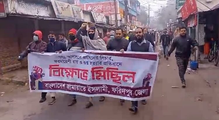 ফরিদপুর জেলা জামায়াতে ইসলামীর বিক্ষোভ মিছিল অনুষ্ঠিত হয়েছে। বাংলাদেশ জামায়াতে ইসলামী ফরিদপুর জেলা শাখার উদ্যোগে সংগঠনের সেক্রেটারী আব্দুল ওহাবের সভাপতিত্বে আজ শনিবার সকাল সাড়ে সাতটায় কেন্দ্রীয় কর্মসূচীর অংশ হিসেবে উক্ত কর্মসূচি পালন করে তারা।