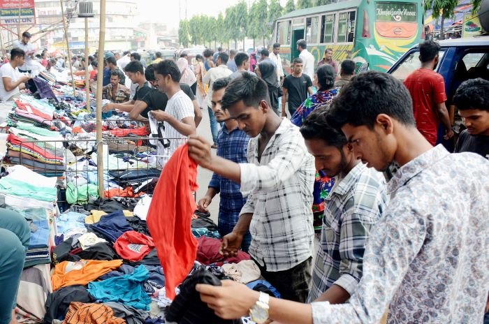 মঙ্গলবার (১৮ এপ্রিল) চট্টগ্রাম নগরীর নিউমার্কেট, জিইসি, চকবাজার বহদ্দারহাট ও আগ্রাবাদ ঘুরে দেখা যায় ফুটপাতের দোকানগুলোর এমন চিত্র। এসময় নগরীর চকবাজার এলাকায় ফুটপাত ব্যতিত বাকী স্থানগুলোতে পুরুষ ও বাচ্চাদের পোশাকই বেশি দেখা গেছে।