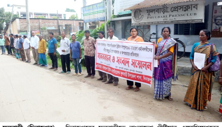 শনিবার (২৯ জুন) সকাল ১০ টায় উপজেলা পরিষদ রোডস্থ ফুলবাড়ী প্রেসক্লাবের সম্মুখে ঘণ্টাব্যাপী মানববন্ধন কর্মসূচি পালন করেন খ্রীষ্টিয়ান ধর্মাবলম্বীর বিভিন্ন বয়সী সাঁওতাল নারী-পুরুষ।