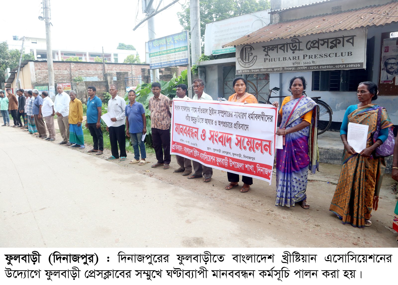 দিনাজপুরের ফুলবাড়ীতে সংবাদ সম্মেলনের নামে খ্রীষ্টিয়ান ধর্মাবলম্বীর সাঁওতালদের ধর্মীয় অনুভূতিতে আঘাত ও অপপ্রচারের প্রতিবাদে বাংলাদেশ খ্রীষ্টিয়ান এসোসিয়েশনের উদ্যোগে মানববন্ধন কর্মসূচি পালনসহ সংবাদ সম্মেলন অনুষ্ঠিত হয়েছে।