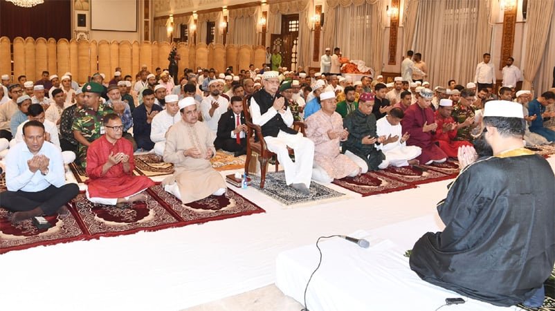রাষ্ট্রপতি মো. সাহাবুদ্দিন আজ জাতির পিতা বঙ্গবন্ধু শেখ মুজিবুর রহমানের ১০৪তম জন্মবার্ষিকী এবং ‘জাতীয় শিশু দিবস-২০২৪’ উপলক্ষে জোহরের নামাজের পর বঙ্গভবনের দরবার হলে বিশেষ দোয়া ও মিলাদ মাহফিলের আয়োজন করেন। ১৯৭৫ সালের ১৫ আগস্টের নির্মম রাতে একদল বিপদগামী সেনা কর্মকর্তার হাতে নৃশংসভাবে নিহত জাতির পিতা বঙ্গবন্ধু শেখ মুজিবুর রহমান ও তাঁর পরিবারের সদস্যদের চিরশান্তি কামনা করে বিশেষ মোনাজাত করা হয়। মিলাদ মাহফিল ও মোনাজাত পরিচালনা করেন বঙ্গভবন জামে মসজিদের পেশ ইমাম মুফতি মাওলানা সাইফুল কাবির। দেশের অব্যাহত শান্তি, অগ্রগতি ও সমৃদ্ধি এবং জনগণের কল্যাণ ও মুসলিম উম্মাহর বৃহত্তর ঐক্য কামনা করে দোয়াও করা হয়। মোনাজাতে রাষ্ট্রপতির পরিবারের সদস্য, বঙ্গভবনের সংশ্লিষ্ঠ সচিবগণ, পদস্থ বেসামরিক ও সামরিক কর্মকর্তা এবং বঙ্গভবনের কর্মচারীরা অংশ নেন। এরআগে জাতির পিতা বঙ্গবন্ধু শেখ মুজিবুর রহমানের জন্মবার্ষিকী ও ‘জাতীয় শিশু দিবস’ উপলক্ষে দুপুরে বঙ্গভবনে আলোচনা সভার আয়োজন করা হয়। আলোচনা সভায় রাষ্ট্রপতির কার্যালয়ে সচিব মো. ওয়াহিদুল ইসলাম খান, সামরিক সচিব মেজর জেনারেল এস এম সালাহউদ্দিন ইসলাম এবং প্রেস সচিব মো. জয়নাল আবেদীন বক্তব্য রাখেন। বক্তারা জাতির পিতা বঙ্গবন্ধুর কর্মময় জীবনের বিভিন্ন দিক তুলে ধরেন। তারা বঙ্গবন্ধুর স্বপ্নের সোনার বাংলা বিনির্মাণে প্রধানমন্ত্রীর গৃহীত কার্যক্রম বাস্তবায়নে সবাইকে ঐক্যবদ্ধভাবে কাজ করার আহ্বান জানান। এরআগে, জাতির পিতা বঙ্গবন্ধু শেখ মুজিবুর রহমানের জীবন ও কর্মের ওপর নির্মিত একটি ভিডিও চিত্র প্রদর্শন করা হয়।
