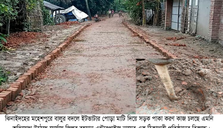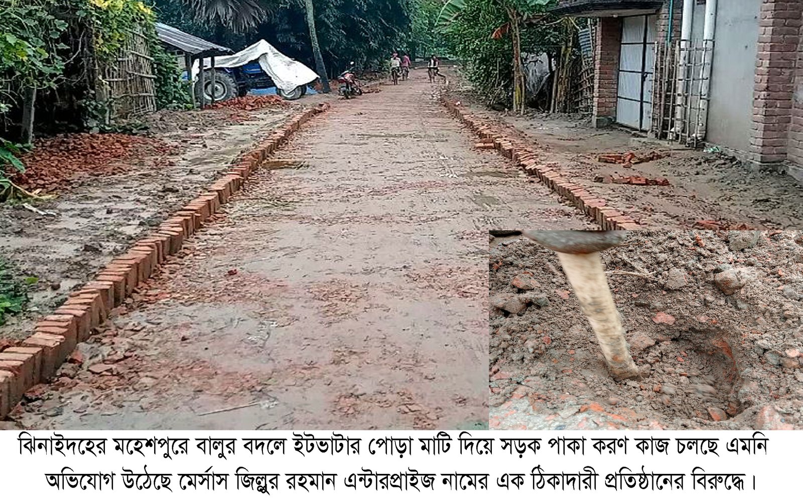 ঝিনাইদহের মহেশপুরে বালুর বদলে ইটভাটার পোড়া মাটি দিয়ে সড়ক পাকা করণের কাজ চলছে এমনি অভিযোগ উঠেছে মের্সাস জিল্লুর রহমান এন্টারপ্রাইজ নামের এক ঠিকাদারী প্রতিষ্ঠানের বিরুদ্ধে। এছাড়াও ওই কাজে নিম্নমানের খোয়া ও ৩ নম্বর ইট দিয়ে রাস্তার এজিং দেওয়া হয়েছে।