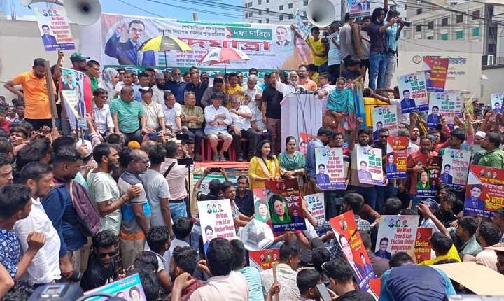 পদযাত্রার শুরুর আগে সংক্ষিপ্ত সমাবেশ করছে বিএনপি। এ জন্য ট্রাকে একটি মঞ্চ করা হয়েছে। বিএনপি মহাসচিব মির্জা ফখরুল ইসলাম আলমগীরের এই সমাবেশে বক্তব্য দেওয়ার কথা।