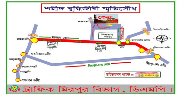 ১৪ ডিসেম্বর শহীদ বুদ্ধিজীবী দিবস উপলক্ষে রাষ্ট্রপতি, প্রধানমন্ত্রী, স্পিকার, প্রধান বিচারপতি, মন্ত্রীপরিষদের সদস্য, সংসদ সদস্য, বিদেশি রাষ্ট্রের কূটনীতি এবং সরকারের উচ্চপদস্থ কর্মকর্তাসহ বিভিন্ন সংগঠনের নেতারা মিরপুর শহীদ বুদ্ধিজীবী স্মৃতিসৌধে গমনাগমণ করবেন। এ উপলক্ষে অত্র এলাকায় যানবাহনের সুষ্ঠু চলাচল নিয়ন্ত্রণকল্পে ভোর ৪টা থেকে সকাল সাড়ে ৯টা পর্যন্ত সকল প্রকার যানবাহন (বাস/ট্রাক/হিউম্যান হলার/থ্রি হুইলার/রিকশা-ভ্যান ইত্যাদি) মিরপুর মাজার রোড (মাজার রোড ক্রসিং থেকে মিরপুর ১ নম্বর ক্রসিং পর্যন্ত) পরিহার করে বিকল্প সড়কে চলাচল করার জন্য অনুরোধ করেছে ঢাকা মহানগর (ডিএমপি) পুলিশ।