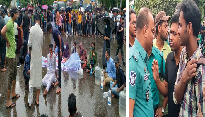 মঙ্গলবার (২২ আগস্ট) দুপুর ১২টা ৪০ মিনিট থেকে নীলক্ষেত মোড় অবরোধ করে আন্দোলন করেছেন তারা। সড়ক অবরোধ করে দাবি আদায়ের জন্য বিভিন্ন স্লোগান দিতে দেখা গেছে তাদের। পরে দুপুর ১টা ৫০ মিনিটের দিকে বৃষ্টি হানা দেয়। এসম অবরোধ কর্মসূচিতে অনড় থাকতে দেখা গেছে শিক্ষার্থীদের। বৃষ্টিতে ভিজেই আন্দোলন চালিয়ে যান শিক্ষার্থীরা।