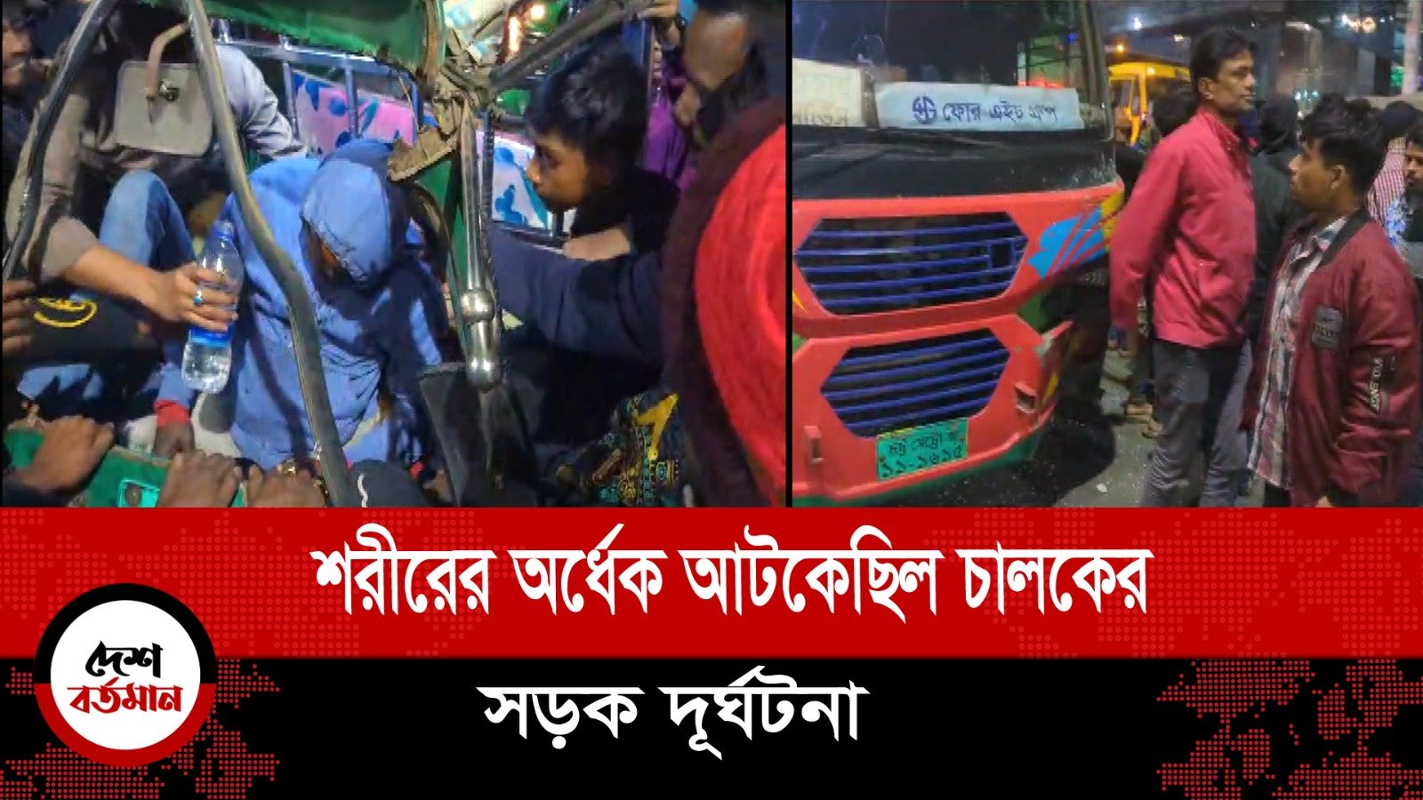 অর্ধেক শরীর ও পা আটকে থাকা ত্রিহুলাইর গাড়ির চালককে দূর্ঘটনার আধঘন্টা পর উদ্ধার করে উপস্থিত যাত্রী ও পথচারীরা। নগরীর শোলক বহর এলাকার এন মোহাম্মদের শো-রুমের সামনের ঘটনা এটি। যেখানে একটি বেপরোয়া গতির ত্রিহুইলার গাড়ির সাথে ফোর এইচ গ্রুপের যাত্রীবাহী মিনি বাসের সাথে ধাক্কা লাগে।
