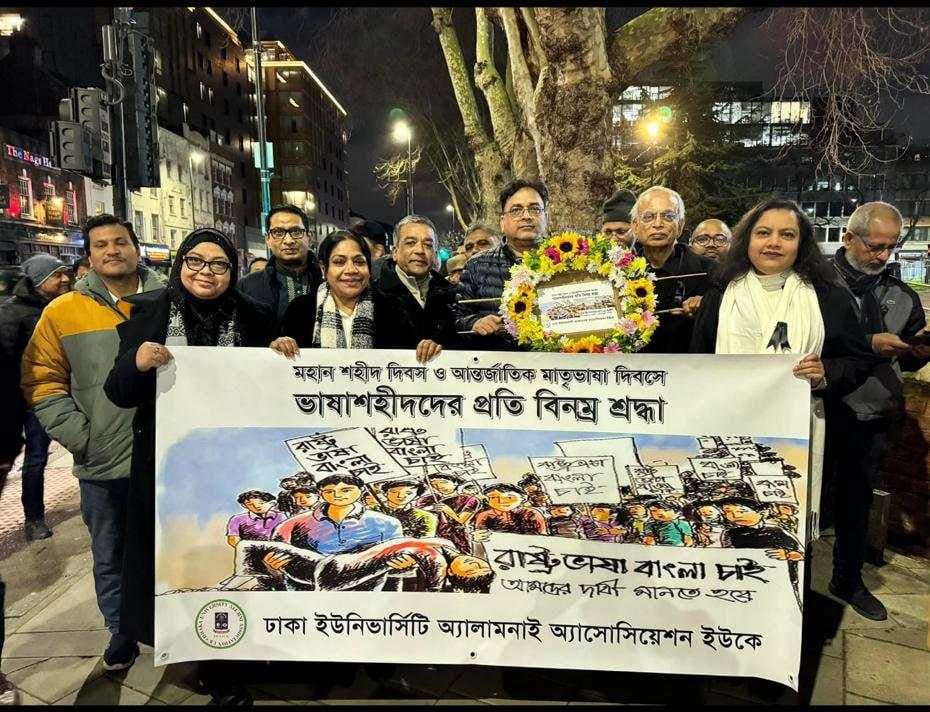 যুক্তরাজ্যে ঢাকা বিশ্ববিদ্যালয়ের অ্যালামনাইদের সংগঠন ঢাকা বিশ্ববিদ্যালয় ক্লাব ইউকের উদ্যোগে স্মরণ করা হয়েছে ভাষাশহীদদের। গত বুধবার মধ্যরাতে ইস্ট লন্ডনের আলতাব আলী পার্কে শহীদ মিনারের বেদীতে পুষ্পস্তবক অর্পণ করে ভাষাশহীদদের স্মরণ করা হয়। সংগঠনের সদস্যরা যুক্তরাজ্যের বিভিন্ন স্থান থেকে আলতাব আলী পার্কের গেটে জড়ো হয়ে অপেক্ষা করতে থাকেন। মিনারের দায়িত্বে নিয়োজিত নিরাপত্তারক্ষীরা প্রবেশদ্বার খুলে দিলে সংগঠনের সভাপতি এনাম হক ও নবনির্বাচিত সভাপতি কচি কবির শিকদার পুষ্পস্তবক অর্পন করেন। অন্যান্য সদস্যদের মধ্যে উপস্থিত ছিলেন নবনির্বাচিত সেক্রেটারি জেনারেল খালেদ মিল্লাত, সলিছিটর আনোয়ার খান, অধীর রঞ্জন দাস, ড. সিরাজুল চৌধুরী, বুলবুল হাসান, সলিছিটর সিন্থিয়া দাস, সলিছিটর হালিম বেপারী, ব্যারিস্টার পল্লবী, অ্যাডভোকেট নার্গিস সাহিদা, ইফতেখার প্রমুখ।