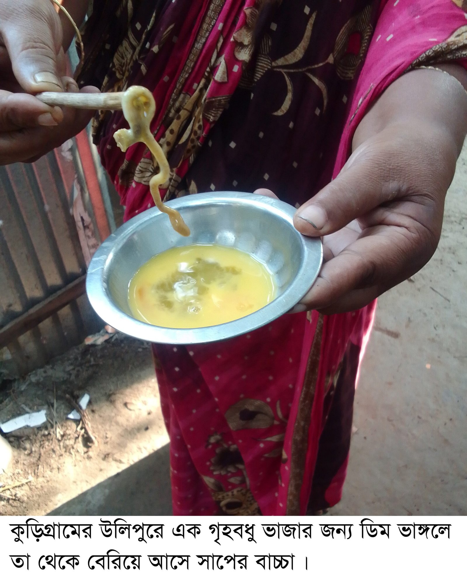 প্রত্যক্ষদর্শী ও এলাকাবাসী আসাদুল (৩০), আছমা বেগম (৫০), ফুল মালা (২৫), হুমাইয়ারা (২০), বিপুল (২০)সহ আরো অনেকে বলেন, প্রতিবেশি ফিরোজ আলমের বাড়িতে হঠাৎ ডাক চিৎকার শুনে তারা এগিয়ে এসে দেখেন বাটিতে ডিমের কুসুমের সাথে একটি সাপের বাচ্চা।