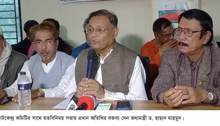 শুক্রবার (৫ জানুয়ারি) সন্ধ্যায় চট্টগ্রাম-৭ আসনে (রাঙ্গুনিয়া ও বোয়ালখালী আংশিক) আওয়ামী লীগ মনোনীত প্রার্থী তথ্যমন্ত্রী ড. হাছান মাহমুদ নির্বাচনী এলাকার ভোট কেন্দ্র কমিটির সাথে মতবিনিময় সভায় প্রধান অতিথির বক্তব্যে এসব কথা বলেন। রাঙ্গুনিয়া উপজেলা আওয়ামী লীগ কার্যালয়ে এই মতবিনিময় সভা অনুষ্ঠিত হয়।