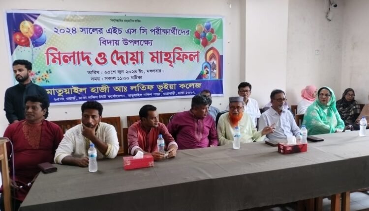 রাজধানীর যাত্রাবাড়ি থানার মাতুয়াইল হাজী আব্দুল লতিফ ভূঁইয়া কলেজের এইচএসসি পরীক্ষার্থীদের বিদায় উপলক্ষে মিলাদ ও দোয়া মাহফিল অনুষ্ঠিত হয়েছে। মঙ্গলবার ২৫ জুন সকাল ১১ টায় কলেজের মিলনায়তনে এই বিদায় অনুষ্ঠান সম্পন্ন হয়। অনুষ্ঠানে সভাপতিত্ব করেন কলেজের অধ্যক্ষ আ.ন.ম মতিউর রহমান। ইসলামের ইতিহাস বিভাগের প্রভাষক এমদাদুল হক বাবুর সঞ্চালনায় এতে প্রধান অতিথি হিসেবে উপস্থিত ছিলেন মাতুয়াইল হাজী আব্দুল লতিফ ভূঁইয়া কলেজের ম্যানেজিং কমিটির সভাপতি যাত্রাবাড়ি থানা আওয়ামী লীগের সাধারণ সম্পাদক পদপ্রার্থী মাতুয়াইল ইউনিয়ন আওয়ামী লীগের সাধারণ সম্পাদক শান্তনুর খান শান্ত। বিশিষ্ট সমাজসেবক ও শিক্ষানুরাগী আবু তাহের মিয়াজী, বিদ্যোৎসাহী সদস্য মোঃ লিটন মিয়া, শিক্ষক প্রতিনিধি সিরাজুল ইসলাম, গার্হস্থ অর্থনীতি বিভাগের অধ্যাপক মোরশেদা বেগম, শিউলি সূজা,ডঃ বাবুল চন্দ্র দাস,সহযোগী অধ্যাপক বিধান চন্দ্র বালা, সহযোগী অধ্যক্ষ মো: আবদুল হাকিম, আবুল বাশার, সিদ্ধার্থ বাবু, শাফিক আফতাবসহ শিক্ষা প্রতিষ্ঠানটির সর্বস্তরের শিক্ষক, কর্মচারী ও শিক্ষার্থীরা।