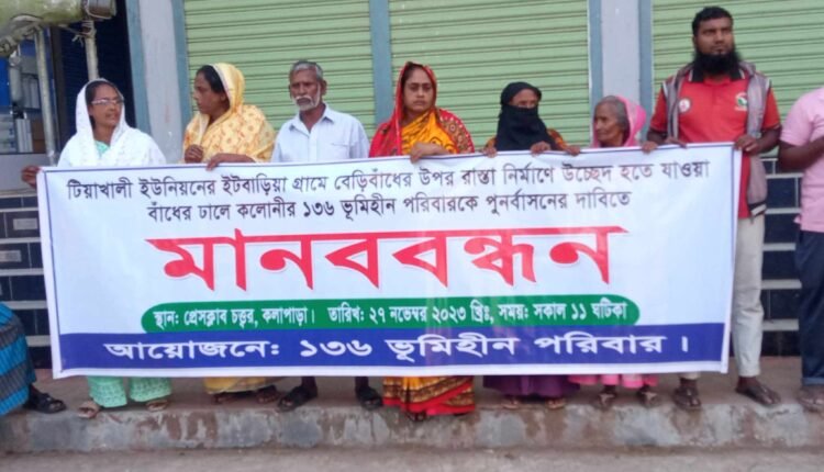 পটুয়াখালীর কলাপাড়ায় ২ নং টিয়াখালী ইউনিয়নের ইটবাড়িয়া গ্রামে বেড়িবাঁধের উপর রাস্তা নির্মাণে উচ্ছেদ হতে যাওয়া বাঁধের ঢালে কলোনীর ১৩৬ ভূমিহীন পরিবারেকে পুনর্বাসনের দাবীতে ২৭ নভেম্বর সোমবার সকাল ১১টায় কলাপাড়া প্রেস ক্লাব চত্তরে মানববন্ধন অনুষ্ঠিত হয়েছে।