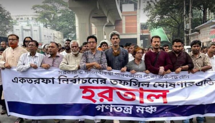 আসন্ন দ্বাদশ জাতীয় সংসদ নির্বাচনকে সামনে রেখে ঘোষিত তফসিল বাতিলের দাবিতে আগামী রবি ও সোমবার (১৯ ও ২০ নভেম্বর) সারা দেশে ৪৮ ঘণ্টার সর্বাত্মক হরতাল ঘোষণা করেছে গণতন্ত্র মঞ্চ। বৃহস্পতিবার (১৬ নভেম্বর) গণতন্ত্র মঞ্চের পক্ষে জাতীয় সমাজতান্ত্রিক দলের (জেএসডি) সিনিয়র যুগ্ম সাধারণ সম্পাদক কামাল উদ্দিন পাটোয়ারীর পাঠানো এক সংবাদ বিজ্ঞপ্তিতে এই কর্মসূচির কথা জানানো হয়।