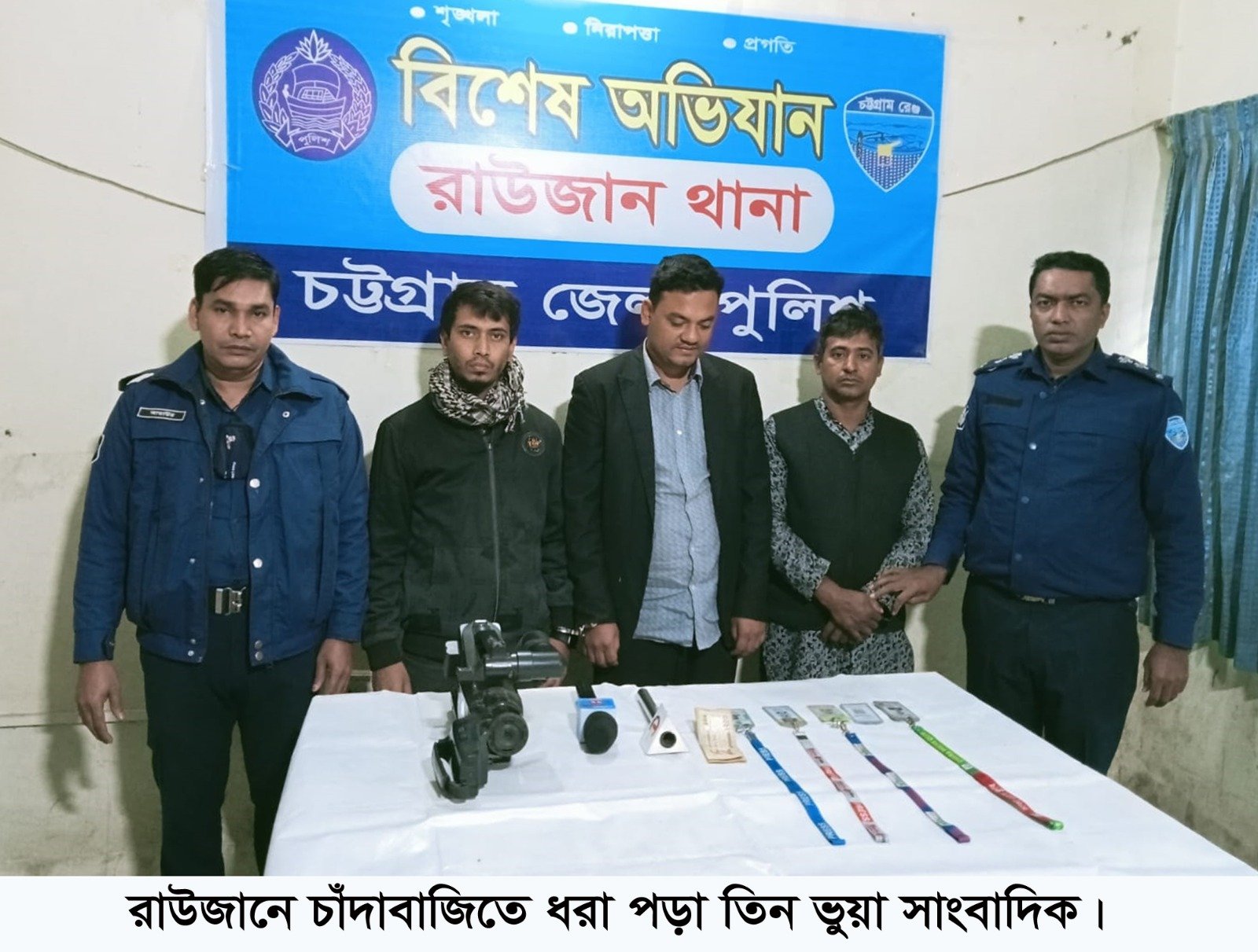 পুলিশ জানায়, তারা তিনজনই প্রতারক। আটক তিনজনের মধ্যে আনোয়ারা উপজেলার মৃত নুর হোসেনের ছেলে আহম্মদ নুর (২৮), তিনি এলাকার চাপাবাজ হিসেবে পরিচিত। হাটহাজারী উপজেলার মোহাম্মদ মিয়ার ছেলে আবুল কালাম (৫২), তিনি একজন সাজাপ্রাপ্ত আসামী। তার বিরুদ্ধে হাটহাজারী থানায় একটি মামলার ৬ মাসের কারাদণ্ড, অনাদায়ে ৬লক্ষ টাকার অর্থদণ্ড, এলাকার চিহ্নিত প্রতারক। একই উপজেলার আবদুর রহমানের ছেলে দিদারুল আলম (৩৫)। তিনি একজন কলাবিক্রেতার, ব্যবসা গুটিয়ে নামেন সাংবাদিকতার নামে চাঁদাবাজিতে।