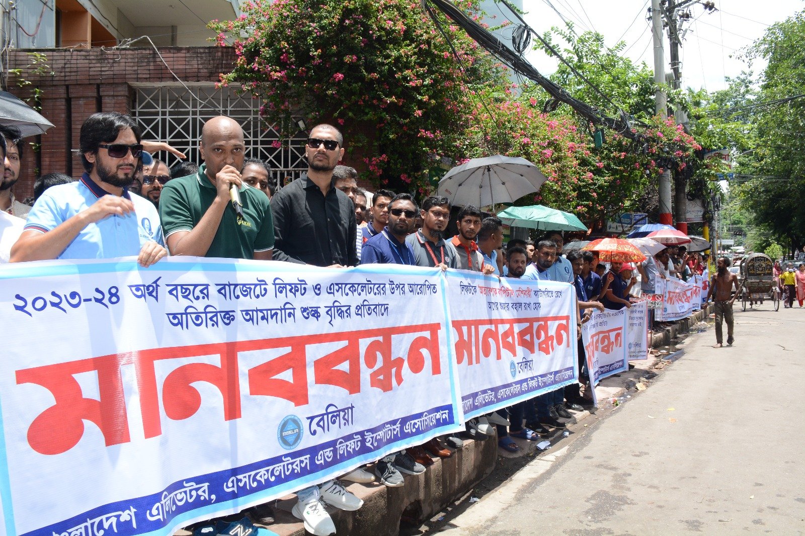 মানববন্ধনে বেলিয়া সাধারণ সম্পাদক মো. শফিউল আলম উজ্জ্বল বলেন, করোনা পরবর্তী গত ২০২২-২০২৩ অর্থবছরে বিশ্বব্যাপী যুদ্ধবিগ্রহ, মুদ্রাস্ফীতি স্থায়ী মন্দা, বিভিন্ন দেশে মুদ্রার অবমূল্যায়ন ইত্যাদি কারণে লিফট সরবরাহকারী প্রতিষ্ঠানগুলো চরম আর্থিক ক্ষতির সম্মুখীন হয়। তারপরও গত অর্থবছরে লিফটের উপরে ৫ শতাংশ শুল্কবৃদ্ধি করায় আমাদানীকারদের আরও বেগতিক অবস্থায় পড়তে হয়েছে এবং গত অর্থবছরে লিফটকে ক্যাপিটাল মেশিনারিজ থেকেও অব্যাহতি দেওয়া হয়।