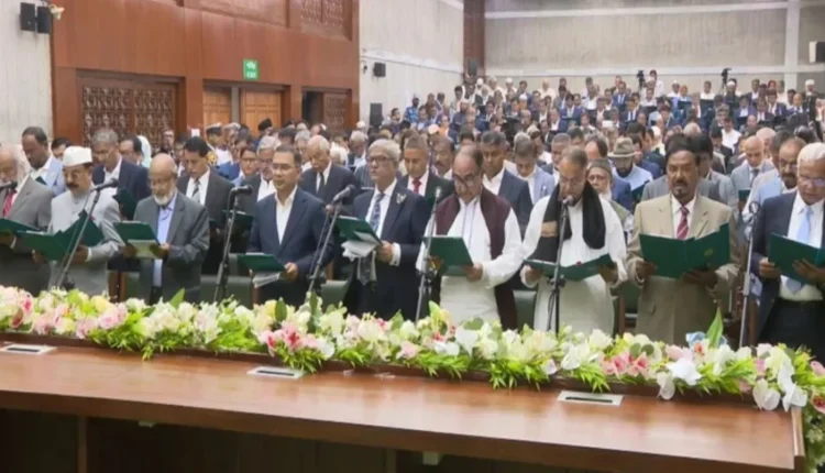 প্রথমে বিএনপি চেয়ারম্যান তারেক রহমানসহ বিএনপি থেকে নির্বাচিত সংসদ সদস্যদের শপথবাক্য পাঠ করান সিইসি। পরে তারা সবাই শপথ বইয়ে স্বাক্ষর করেন।