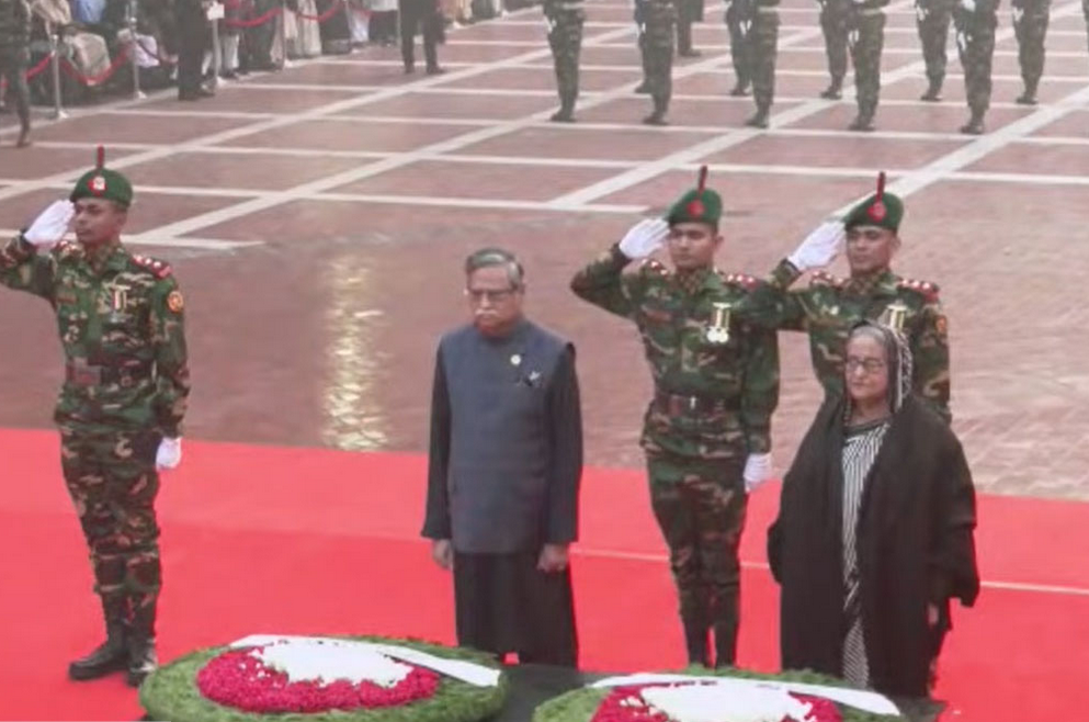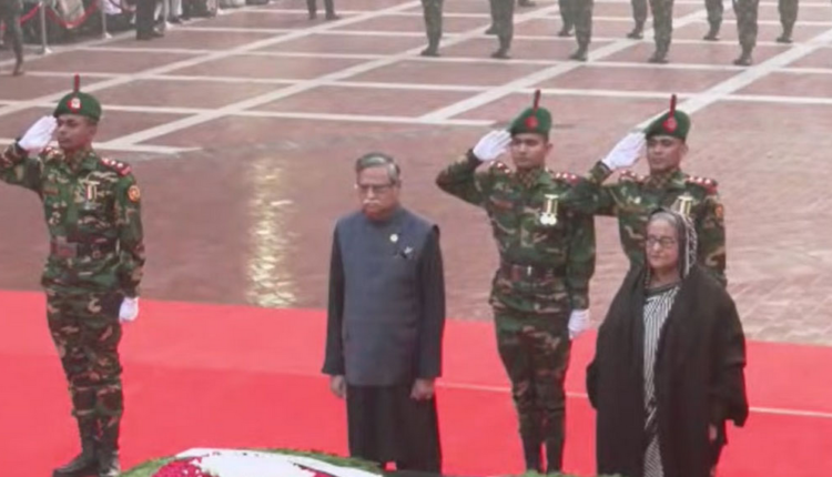 বৃহস্পতিবার (১৪ ডিসেম্বর) সকাল ৭টা ১ মিনিটে শহীদ বুদ্ধিজীবী দিবস উপলক্ষ্যে এ শ্রদ্ধা জানান তারা। স্মৃতিসৌধে পুষ্পস্তবক অর্পণের পর কিছুক্ষণ নীরবে দাঁড়িয়ে থাকেন রাষ্ট্রপতি ও প্রধানমন্ত্রী। এ সময় বিউগলে বাজানো হয় করুণ সুর।