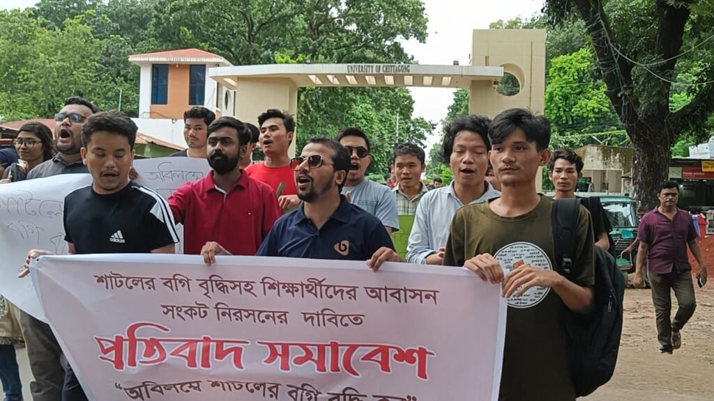 চট্টগ্রাম বিশ্ববিদ্যালয়ের (চবি) শাটল ট্রেনে বগি বৃদ্ধি ও আবাসন সংকট নিরসনের দাবিতে যৌথভাবে প্রতিবাদ সমাবেশ করেছে বাংলাদেশ ছাত্র ইউনিয়ন চবি সংসদ ও পার্বত্য চট্টগ্রাম পাহাড়ী ছাত্র পরিষদ।