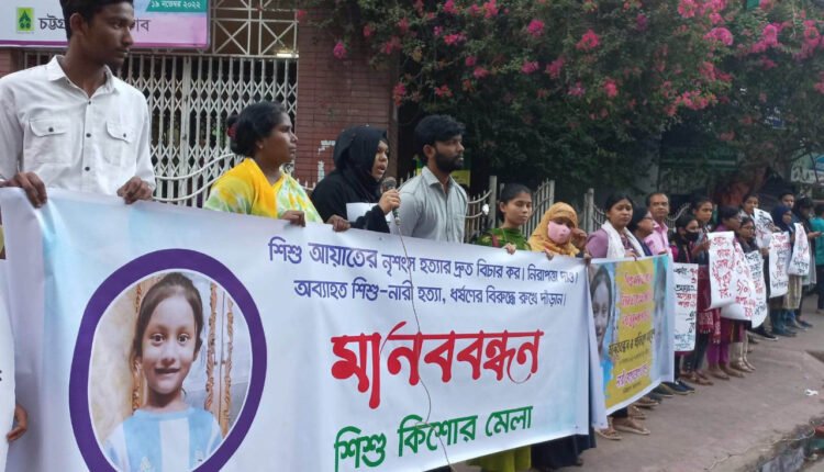 রোববার ((২৭ নভেম্বর) বিকেলে চট্টগ্রাম প্রেসক্লাব চত্বরে আয়াত, বর্ষাসহ সকল শিশু হত্যার দ্রুত বিচার ও শিশুদের নিরাপত্তার দাবিতে শিশু কিশোর সংগঠন শিশু কিশোর মেলা মানববন্ধন ও বিক্ষোভ সমাবেশে বক্তারা এসব কথা বলেন ।