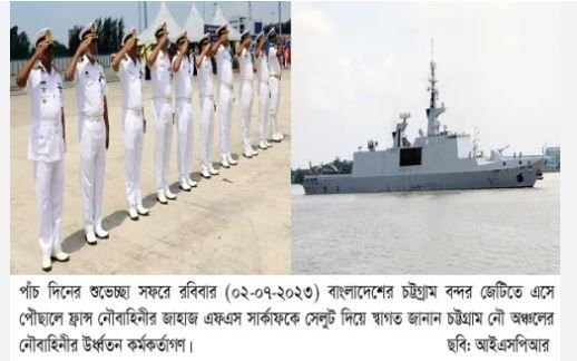 পাঁচ দিনের শুভেচ্ছা সফরে বাংলাদেশে এসেছে ফরাসী নৌবাহিনীর জাহাজ এফএস সার্কাফ। রোববার (২ জুলাই) জাহাজটি চট্টগ্রাম বন্দর জেটিতে নোঙর করে। এসময় চট্টগ্রাম নৌ অঞ্চলের চিফ স্টাফ অফিসার ক্যাপ্টেন ফয়েজ জাহাজটিকে স্বাগত জানান।