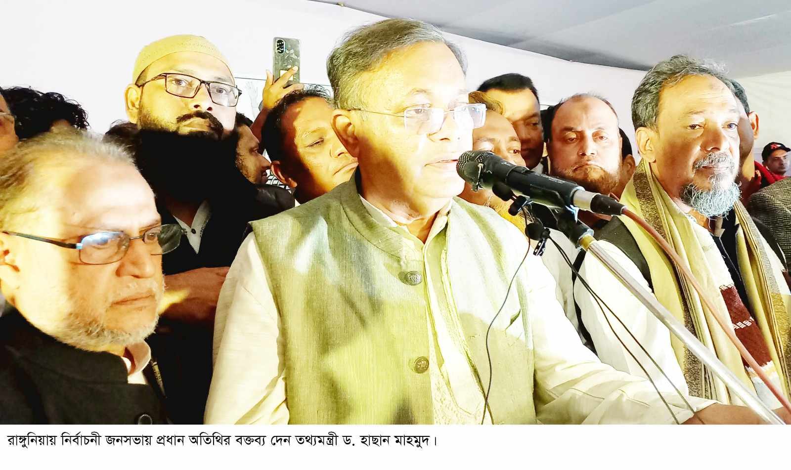 মঙ্গলবার (২৬ ডিসেম্বর) সন্ধ্যা সাড়ে ৭টায় চট্টগ্রাম-৭ আসনে আওয়ামী লীগ মনোনীত প্রার্থী তথ্য ও সম্প্রচার মন্ত্রী ড. হাছান মাহমুদ নির্বাচনী জনসভায় প্রধান অতিথির বক্তব্যে এসব কথা বলেন। রাঙ্গুনিয়া পৌরসভা, মরিয়মনগর, চন্দ্রঘোনা কদমতলি ও স্বনির্ভর রাঙ্গুনিয়া ইউনিয়ন আওয়ামী লীগ এই জনসভার আয়োজন করে। পৌরসভা আওয়ামী লীগের সভাপতি আরিফুল ইসলাম চৌধুরী ও সাধারণ সম্পাদক মো. সেলিমের সঞ্চালনায় রোয়াজারহাটস্থ রাঙ্গুনিয়া ক্লাব মাঠে আয়োজিত জনসভায় সভাপতিত্ব করেন পৌরসভার মেয়র মো. শাহজাহান সিকদার। এরআগে বিকেলে ড. হাছান মাহমুদ রাঙ্গুনিয়ার পোমরা ইউনিয়নে গণসংযোগ ও বিভিন্ন পথসভায় বক্তব্য রাখেন।