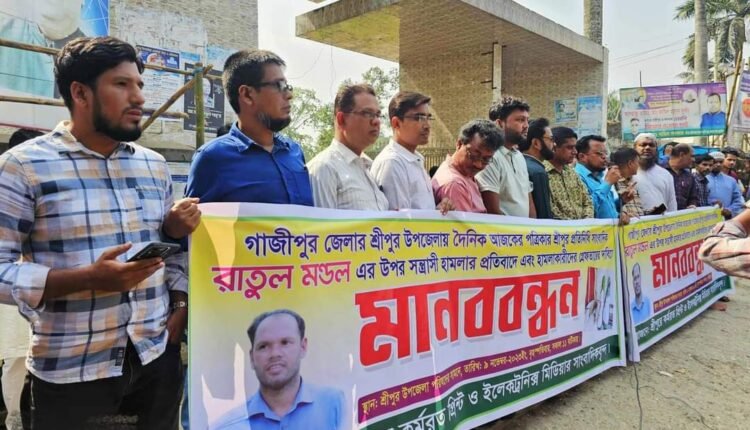 আজকের পত্রিকা শ্রীপুর প্রতিনিধি সাংবাদিক রাতুল মণ্ডলের উপর সন্ত্রাসী হামলার প্রতিবাদে এবং হামলাকারীদের গ্রেপ্তার দাবিতে মানববন্ধন বিক্ষোভ কর্মসূচি এবং স্মারক লিপি দিয়েছে সাংবাদিকরা।