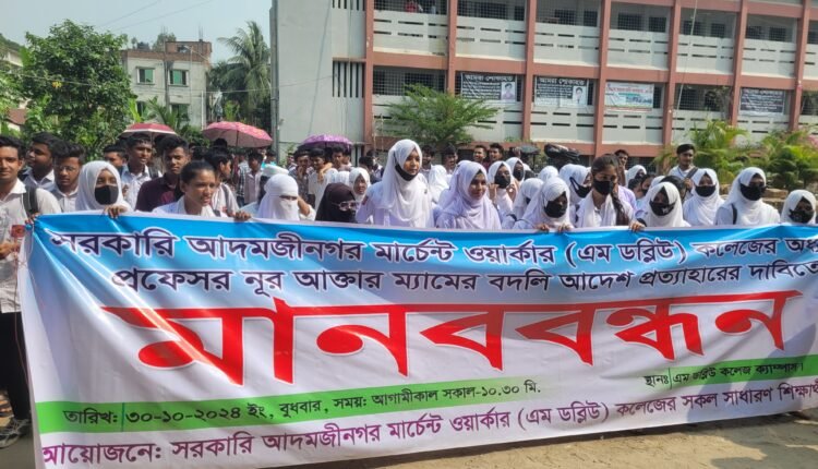 বুধবার (৩০ অক্টোবর) সকালে আদমজীনগর এম ডব্লিউ কলেজ প্রাঙ্গণে কলেজের সাধারণ শিক্ষার্থীবৃন্দদের আয়োজনে এ মানববন্ধন কর্মসূচি পালন করা হয়। এ মানববন্ধনে অংশ নেন অত্র কলেজের সাবেক শিক্ষার্থীরাও।