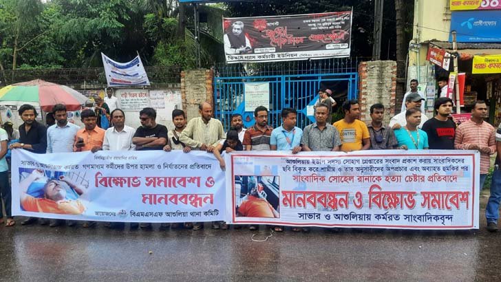সাংবাদিকের ওপর হামলার প্রতিবাদে কুষ্টিয়ায় মানববন্ধন করেছেন কুষ্টিয়া টেলিভিশন জার্নালিস্ট এসোসিয়েশন। শনিবার বেলা সাড়ে ১১টায় কুষ্টিয়ার ৫ রাস্তার মোড় মুজিব চত্বরে এ মানববন্ধন থেকে সাংবাদিকরা ৭২ ঘন্টার মধ্যে হামলাকারীদের গ্রেফতারের আলটিমেটাম দিয়েছেন। কুষ্টিয়া টেলিভিশন জার্নালিস্ট এসোসিয়েশনের সভাপতি মো. জাহিদুজ্জামান আল্টিমেটাম দিয়ে বলেন, এ সময়ের মধ্যে আসামি গ্রেফতার না হলে মডেল থানা, পুলিশ সুপারের কার্যালয় ঘেরাও, রাজপথ অবরোধ ও স্থানীয় পত্রিকাসহ সকল গণমাধ্যমে কলম বিরতির মতো কঠোর কর্মসূচি দেয়া হবে।
