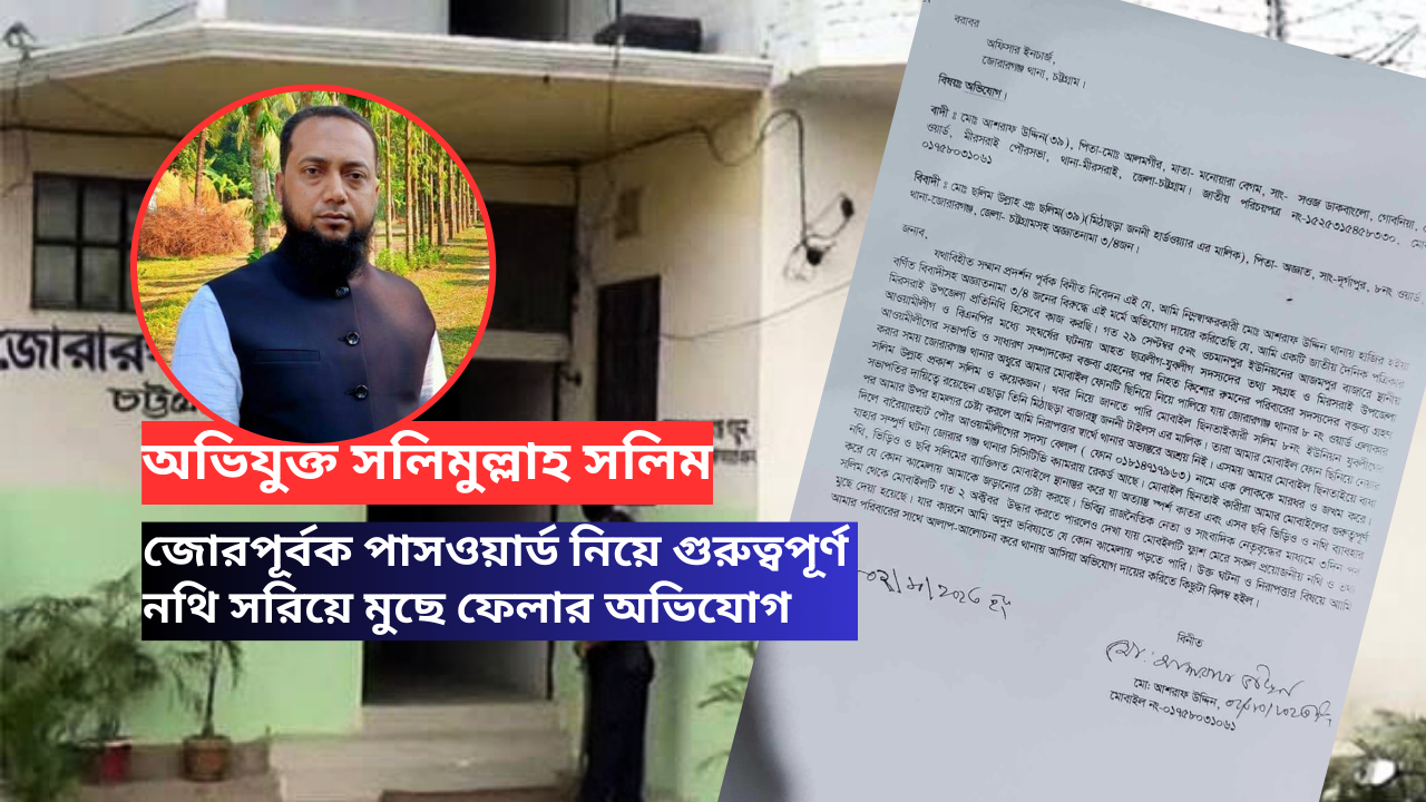 ‘পরে নিজের নিরাপত্তার জন্য জোরারগঞ্জ থানায় ভেতরে আশ্রয় নিলে সেখানেও তারা আমার ওপর হামলার চেষ্টা করে এবং জোরপূর্বক মোবাইলের পাসওয়ার্ড দিতে বাধ্য করে। পরে তারা মোবাইলের ভেতরে থাকা গুরুত্বপূর্ণ নথি, ছবি ও ভিডিও মুছে ফেলে।