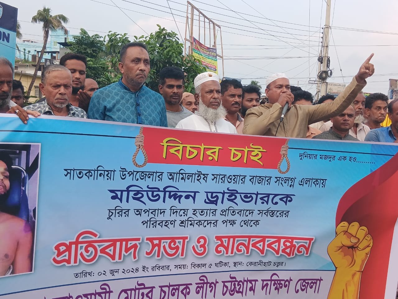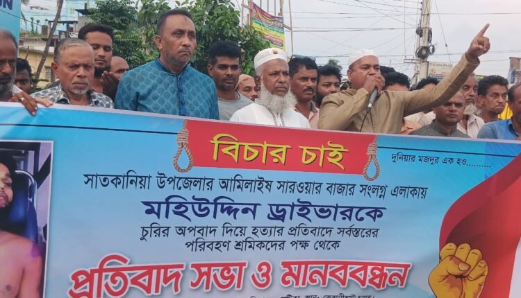 চট্টগ্রামের সাতকানিয়া উপজেলার আমিলাইষ ইউনিয়নে চোর সন্দেহে গাড়ী চালক মো. মহিউদ্দিনের হত্যাকাণ্ডে জড়িতদের বিচার দাবিতে চট্টগ্রাম দক্ষিণ জেলা আওয়ামী মটর চালক লীগের উদ্যোগে বিশাল মানববন্ধন ও বিক্ষোভ কর্মসূচি পালিত হয়েছে।