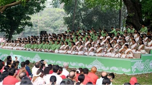 ভোরে সূর্য ওঠার সঙ্গে সঙ্গে মানুষের জয়গানের মধ্য দিয়ে বাংলা নতুন বছরকে স্বাগত জানিয়েছে সাংস্কৃতিক চর্চা কেন্দ্র ছায়ানট। প্রতিবারের মতো এবারো রমনার বটমূলে সুরের মাধুরীতে বরণ করে নেওয়া হয় নতুন বছরকে। ভোরের আলো ফুটতেই আহীর ভৈরব রাগে বাঁশির সুরে শুরু হয় এ আয়োজন। এতে ছায়ানটের শিল্পীদের পাশাপাশি অংশ নিয়েছেন অন্য শিল্পীরাও। রবীন্দ্র-নজরুলের গানের সঙ্গে জায়গা করে নিয়েছে লোকজ সুরও।