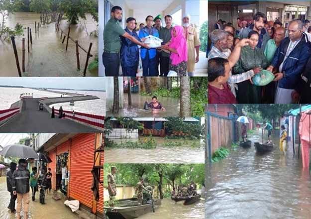 বন্যাপ্লাবিত ভাটির জনপদ সুনামগঞ্জের একদিকে পাহাড়ী ঢল অন্যদিকে উজানেও বৃষ্টি ভাটিতেও বৃষ্টি। ঢল ও ভারী বৃষ্টিপাতে সৃষ্ট বন্যার পানিতে জনজীবন বিপর্যস্ত হয়ে পড়েছে। প্রতিদিন নতুন নতুন এলাকা প্লাবিত হচ্ছে। ঘরবন্দি লোকজনের আর্তনাদ বাড়ছে। বন্যার পানিতে ভেসে গেছে খামারের মাছ ও হাঁস। আমন, আউশ, ইরি ধানি জমি পানির নীচে। নলকুপ নিমজ্জিত থাকায় বিশুদ্ধ পানির সংকট দেখা দিয়েছে। গো-খাদ্যের অভাবে বিপাকে পড়েছেন কৃষক। ব্যবসা প্রতিষ্ঠান থেকে শুরু করে শিক্ষাঙ্গন, মসজিদ, মন্দির ও কবরস্থান প্লাবিত হয়ে ব্যাপক ক্ষতি ও ভোগান্তি পোহাতে হচ্ছে বন্যার্তদেরকে। রাস্তাঘাটের পাশাপাশি বাসাবাড়িতে পানি প্রবেশ করে দুর্ভোগ আরও বেড়েছে। অনেক জায়গায় চুলা-নলকূপও ডুবেছে। বন্যায় পানিবন্দি অবস্থায় মানবেতর জীবন যাপন করছেন জেলার ৬ লক্ষাধিক মানুষ। এ রিপোর্ট লেখা পর্যন্ত জানা যায়, বৃহস্পতিবার (২০ জুন) ভোর পর্যন্ত জেলার প্রধান নদী সুরমা,কালনী,কুশিয়ারা ও যাদুকাটা নদীর পানি বিপদসীমার উপর দিয়ে প্রবাহিত হচ্ছে। তবে পানি উন্নয়ন বোর্ড (পাউবো) জানিয়েছে বুধবার বিকেল ২টা থেকে রাত ১২টা পর্যন্ত পানি স্থির রয়েছে। প্রথম দিকে জেলার ৩টি উপজেলা বন্যা কবলিত হলেও এখন সারা জেলার ১২টি উপজেলা ঢলের পানিতে প্লাবিত হচ্ছে। হাওর এলাকায় খবর নিয়ে জানা গেছে, দিনে মাঝে মাঝে বৃষ্টি বন্ধ হলেও মুহুর্তেই কালো হয়ে উঠে আকাশ। নামে অবিরাম বর্ষণ এবং বর্ষণের সাথে শুরু হয় গর্জন। ভোগান্তি আর আতংক এখন সুনামগঞ্জবাসীর নিত্য সঙ্গী। একটানা ৪ দিন ধরে পাহাড়ী ঢলের সাথে লড়াই করে চলছেন বানভাসিরা। পানিবন্দি হয়ে পড়ায় অনেকেই বাসা বাড়ী ছেড়ে দিয়েছেন। আবার অনেকেই আশ্রয় কেন্দ্রে ঠাঁই নিয়েছেন। সুগতনামগঞ্জ সদর উপজেলার ইব্রাহিমপুর গ্রামের দিনমজুর ইব্রাহিমপুর মিয়া বলেন,২০২২ সালের ১৭ জুন শুক্রবার সাড়ে ১২টায় ইব্রাহিমপুর সরকারী প্রাথমিক বিদ্যালয় আশ্রয়কেন্দ্রে অনাহারে মারা যান আমার পিতা জারীগানের শিল্পী মো.আশরাফ আলী। বন্যার পানিতে লাশ বেধে রাখা অবস্থায় ৬দিন পর কবরস্থানের মাটি জলমুক্ত হলে আমার বাবার লাশ দাফন করি। এবারও আমাদের সেই বসতঘরটি সোমবার (১৭ জুন) পবিত্র ঈদুল আযহার দিনে প্রথম দফার বন্যার পানিতে ডুবে যায়। আমরা স্বপরিবারে আশ্রয় নিয়েছি আমাদের বোন সুরমা ইউপি সদস্যা তানজিনা বেগমের বসতঘরে। বুধবার (১৯ জুন) দিনব্যাপী সুনামগঞ্জ কারিগরী প্রশিক্ষণ কেন্দ্র ও জেলা আনসার ভিডিপি কার্যালয় আশ্রয়কেন্দ্র ছাড়াও সদর ও বিশ্বম্ভরপুর উপজেলার বেশ কয়েকটি আশ্রয়কেওন্দ্রে শুকনো খাবারসহ ত্রাণসামগ্রী বিতরণ করেছেন সুনামগঞ্জ ৪ (সদর বিশ্বম্ভরপুর) আসনের সংসদ সদস্য ড.মোহাম্মদ সাদিক ও জেলা প্রশাসক মোহ