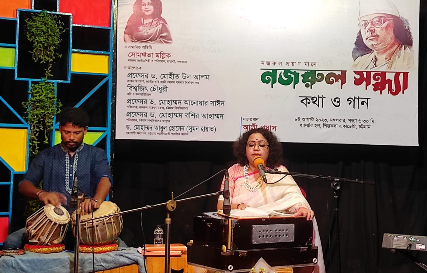 আলোচনা পর্ব শেষে শ্রাবণের ধারার মতো সুরের আবেশ ছড়িয়ে গেলেন ভারতীয় সংগীতশিল্পী সোমঋতা মল্লিক। সুরেলা সন্ধ্যায় ক্ষণে ক্ষণে ছড়ান মুগ্ধতার আবেশ। মিলনায়তনভর্তি দর্শকেরা দুই ঘণ্টা বন্দী ছিলেন অন্যরকম মায়াজালে। জাতীয় কবি কাজী নজরুল ইসলামের অমর সৃষ্টি, ‘আমি চিরতরে দূরে চ’লে যাব, তবু আমারে দেব না ভুলিতে…’ গানে শুরুতেই ডুবে গিয়েছিলেন জেলা শিল্পকলা একাডেমির গ্যালারি হলের দর্শকেরা। এরপর ভারতীয় শিল্পী সোমঋতা মল্লিক গেয়ে শোনান ‘আমার আপনার চেয়ে আপন যে জেন…… রিম ঝিম রিম ঝিম ঝিম ঘন দেয়া…. ’সহ বেশ কিছু নজরুলসংগীত ।