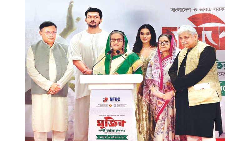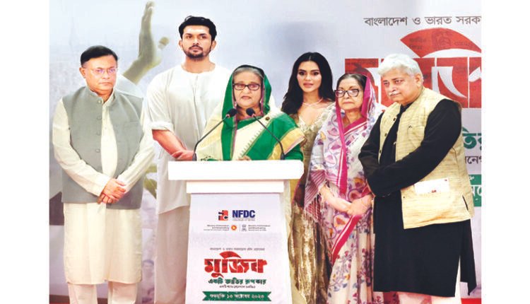 সিনেমা হলে গিয়ে ‘মুজিব : একটি জাতির রূপকার’ চলচ্চিত্রটি দেখার আমন্ত্রণ জানিয়েছেন প্রধানমন্ত্রী শেখ হাসিনা। গতকাল বৃহস্পতিবার সকাল ১০টায় রাজধানীর আগারগাঁওয়ে বাংলাদেশ ফিল্ম আর্কাইভে সিনেমাটির প্রিমিয়ার শোতে যোগ দিয়ে বক্তব্যে আহ্বান জানান তিনি। বঙ্গবন্ধু শেখ মুজিবুর রহমানের জীবনী নিয়ে তৈরি সিনেমাতে অনেক অজানা বিষয় আছে বলে জানান তিনি।