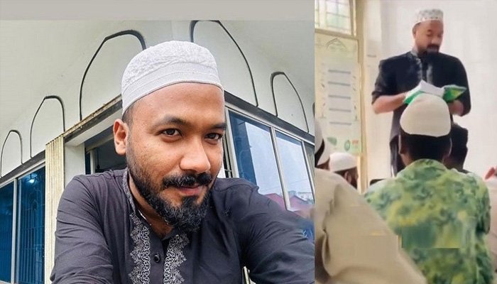 এছাড়া আরও একটি ছবিতে দেখা যায়, পলাশ মসজিদের ভেতর ধর্মীয় গ্রন্থ পাঠ করছেন, সামনে মুসল্লিরা বসে শুনছেন।