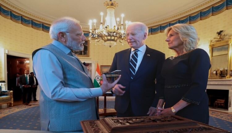 হোয়াইট হাউসে মার্কিন প্রেসিডেন্ট জো বাইডেনের সঙ্গে দ্বিপাক্ষিক বৈঠক করেছেন ভারতের প্রধানমন্ত্রী নরেন্দ্র মোদি। পরে বাইডেন পরিবারের সাথে এক নৈশভোজে যোগ দেন মোদি। রাষ্ট্রীয় সফরে যুক্তরাষ্ট্র যাওয়া ভারতের প্রধানমন্ত্রীকে বুধবার স্বাগত জানান জো বাইডেন ও জিল বাইডেন। এনবিসি নিউজের প্রতিবেদনে এ তথ্য জানা গেছে।