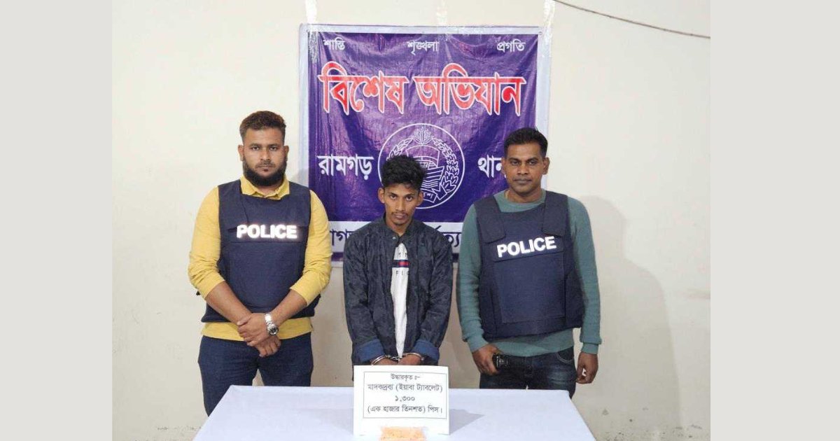 ১৩০০ পিস ইয়াবা নিয়ে যুবক ধরা পড়ল রামগড় পুলিশের হাতে। বৃহস্পতিবার (২৮ ডিসেম্বর) রাতে রামগড় বাজারের উপজেলা পরিষদ সড়কের গণপাঠাগারের সামনে থেকে ইয়াবাসহ তাকে আটক করা হয়। গ্রেফতার অভিযানে নেতৃত্ব দেন রামগড় থানার এসআই মহসিন মোস্তফা।