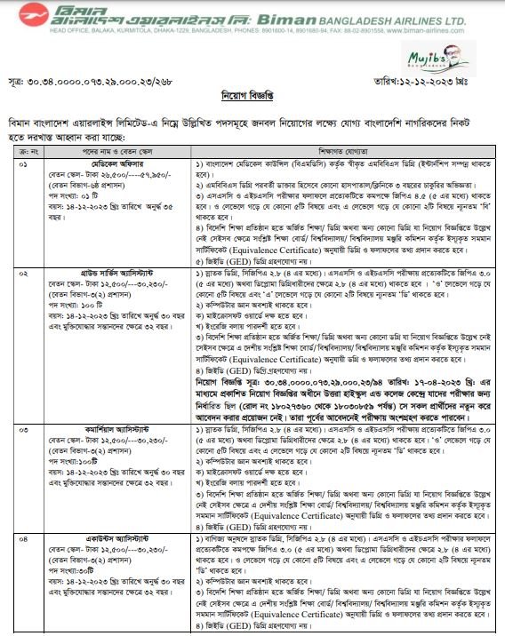 সম্প্রতি জনবল নিয়োগের জন্য বিজ্ঞপ্তি প্রকাশ করেছে বিমান বাংলাদেশ এয়ারলাইন্স।  প্রতিষ্ঠানটি ৪টি ক্যাটাগরিতে ২৩১ জনকে নিয়োগ দেবে।  আগ্রহীরা অনলাইনে আবেদন করতে পারবেন।  নিয়োগসংক্রান্ত বিস্তারিত তথ্য জানা যাবে এই লিংকে