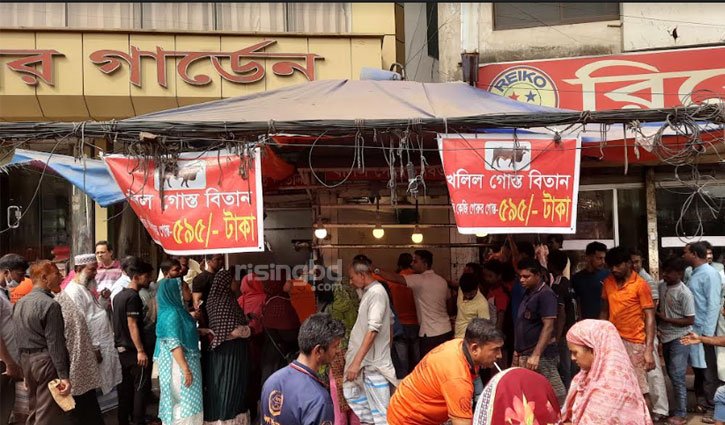 বাজারে সাধারণত গরুর মাংস বিক্রি হয় ৭৫০-৮০০ টাকা কেজি। সেই গরুর মাংসের দাম প্রায় কেজিতে ২০০ টাকা কমেছে। ক্রেতারা হুমড়ি খেয়ে পড়েছেন খলিলের গরুর মাংসের দোকানে। সকাল থেকেই মাংস কিনতে রীতিমতো লাইন ধরেছেন ক্রেতারা। কেউ কিনছেন দুই কেজি, আবার কেউ কিনছেন পাঁচ থেকে দশ কেজি। রাজধানীর শাজাহানপুরের খলিল গোস্ত বিতানে ৫৯৫ টাকা কেজিতে বিক্রি হচ্ছে গরুর মাংস। এই মাংস কিনতে দীর্ঘ লাইন দেখা গেছে। একলাইনে নারীরা মাংস ক্রয় করছেন, অন্য লাইনে পুরুষেরা। কমলা রঙের টিশার্ট পরিহিত দোকানের কর্মচারীরা একটার পর একটা গরু এনে জবাই করে বিক্রির জন্য প্রস্তুত করছেন। এসব কিছুর দেখাশোনা