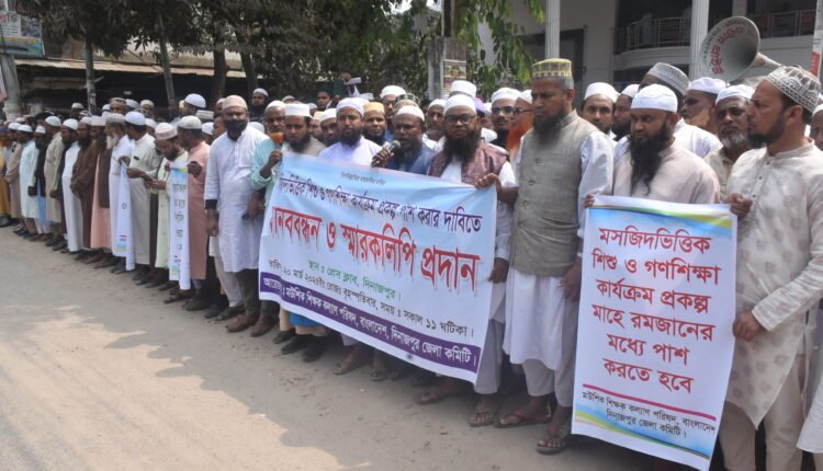 ইসলামিক ফাউন্ডেশনের অধীনে পরিচালিত মসজিদ ভিত্তিক শিশু ও গণশিক্ষা কার্যক্রম প্রকল্পে কর্মরতদের চাকুরী জাতীয়করন এবং ৪ মাসের বকেয়া বেতন বোনাস ঈদের আগে পরিশোধসহ ৫ দফা দাবিতে মউশিক কল্যান পরিষদের ডাকে গতকাল ২০মার্চ বৃহস্পতিবার সকালে দিনাজপুর প্রেস ক্লাবের সামনে মানববন্ধন কর্মসূচি পালন শিক্ষক শিক্ষিকাসহ সংশ্লিষ্ট কর্মচারিরা।