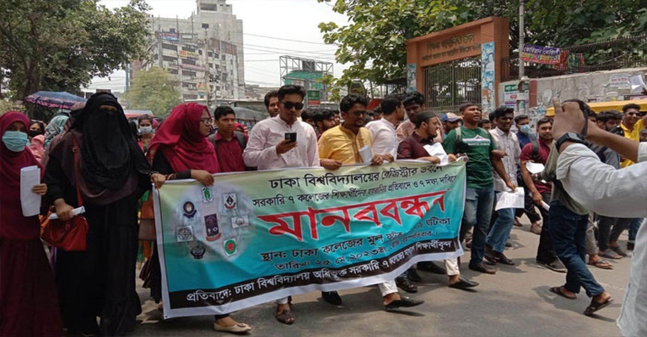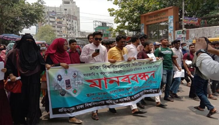 সাত দফা দাবিতে মানববন্ধন করেছে ঢাকা বিশ্ববিদ্যালয়ের অধিভুক্ত সরকারি ৭ কলেজের শিক্ষার্থীরা।