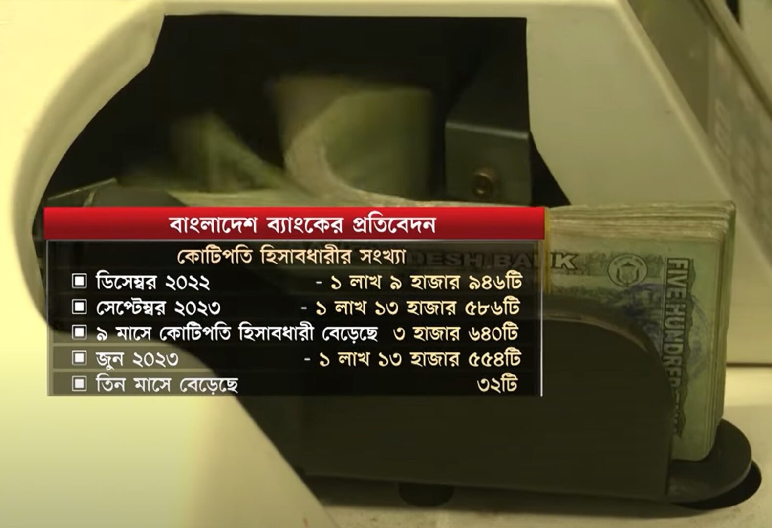 কেন্দ্রীয় ব্যাংকের প্রতিবেদন বলছে, ৫০ কোটি টাকার বেশি জমা আছে এমন আমানতের হিসাব গত বছরের ডিসেম্বরে ছিল এক হাজার ৭৬২টি, গত সেপ্টেম্বরে তা বেড়ে দাঁড়িয়েছে এক হাজার ৭৭৮টি। ৪০ কোটি টাকার বেশি থেকে ৫০ কোটি টাকার কম এমন আমানতকারীর হিসাব গত বছরের ডিসেম্বরে ছিল ৫৭৭টি। গত সেপ্টেম্বরে তা বেড়ে দাঁড়িয়েছে ৭৪৭টি।