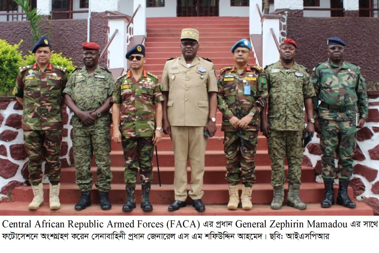 সেন্ট্রাল আফ্রিকান রিপাবলিক সফর শেষে আজ বুধবার দেশে ফিরেছেন সেনাবাহিনী প্রধান জেনারেল এস এম শফিউদ্দিন আহমেদ। সফরের ১ম দিন গত ২৭ অক্টোবর সেন্ট্রাল আফ্রিকান রিপাবলিক এ জাতিসংঘ শান্তিরক্ষা মিশনে নিয়োজিত বাংলাদেশি কন্টিনজেন্টসমূহ ও বাংলাদেশি শান্তিরক্ষীদের বিভিন্ন কার্যক্রম সম্পর্কে সেনাবাহিনী প্রধানকে ব্রিফিং প্রদান করা হয়। এসময় তিনি মূল্যবান দিকনির্দেশনা প্রদান করেন। এরপর সেনাবাহিনী প্রধান Central African Republic Armed Forces (FACA) এর প্রধান General Zephirin Mamadou এর সাথে দ্বি-পাক্ষিক বৈঠক করেন। এসময় সেনাবাহিনী প্রধান দুই দেশের সেনাবাহিনীর মধ্যকার দ্বিপাক্ষিক সম্পর্ক ও পারস্পরিক সহযোগিতার বিষয়ে আলোচনা করেন।