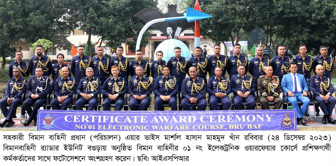 বাংলাদেশ বিমান বাহিনীর ৬৩তম ফ্লাইং ইন্সট্রাক্টরস্ কোর্স এবং ০১ নং ইলেকট্রনিক ওয়ারফেয়ার কোর্স এর সনদপত্র বিতরণ করা হয়েছে। রোববার বাংলাদেশ বিমান বাহিনী ফ্লাইং ইন্সট্রাক্টরস্ স্কুল, বগুড়া এবং বিমানবাহিনী র্যাডার ইউনিট বগুড়ায় এ সনদ বিতরণ করেন সহকারী বিমান বাহিনী প্রধান (পরিচালন) এয়ার ভাইস মার্শাল হাসান মাহমুদ খাঁন। অনুষ্ঠারে প্রধান অতিথি হিসেবে উপস্থিত থেকে কোর্সে অংশগ্রহকারী প্রশিক্ষণার্থী কর্মকর্তাদের মাঝে সনদপত্র বিতরণ করেন তিনি।
