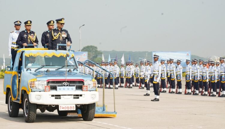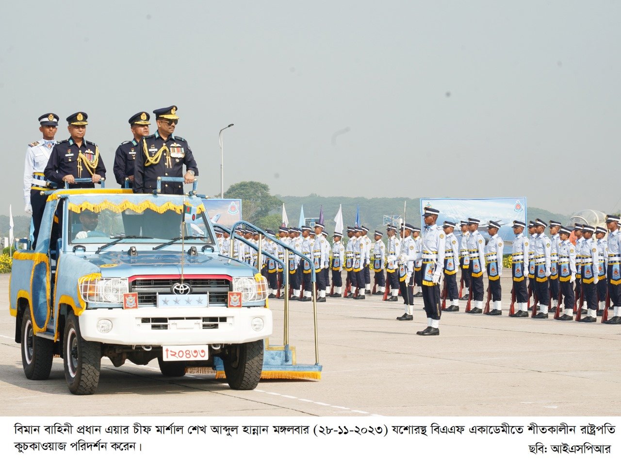 বাংলাদেশ বিমান বাহিনী একাডেমিতে কমিশন প্রাপ্তি উপলক্ষ্যে রাষ্ট্রপতি কুচকাওয়াজ (শীতকালীন)-২০২৩ অনুষ্ঠিত হয়েছে। মঙ্গলবার যশোর বিমান বাহিনী একাডেমি প্যারেড গ্রাউন্ডে আয়োজিত কুচকাওয়াজ পরিদর্শন করেন বিমান বাহিনী প্রধান এয়ার চীফ মার্শাল শেখ আব্দুল হান্নান।