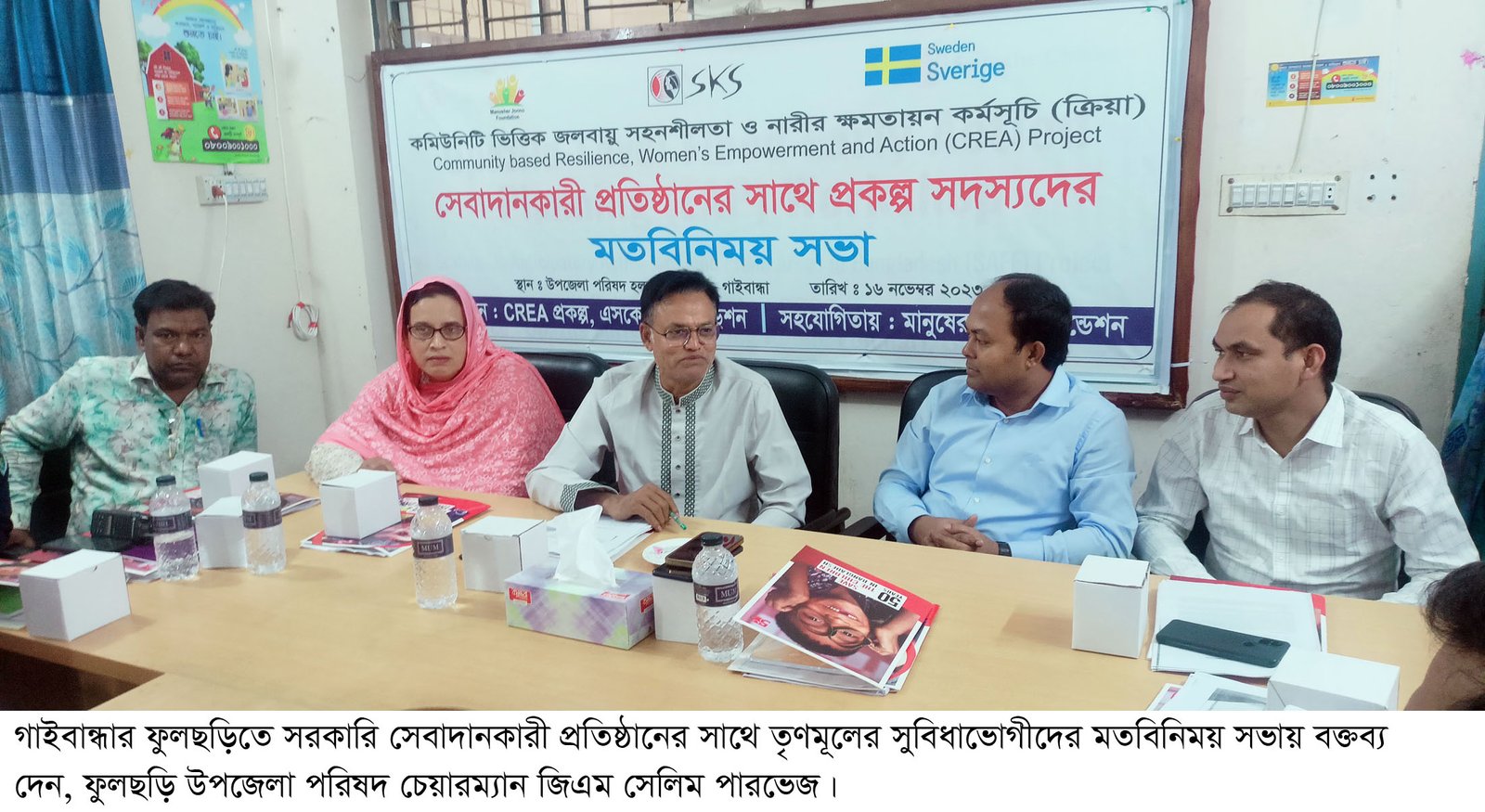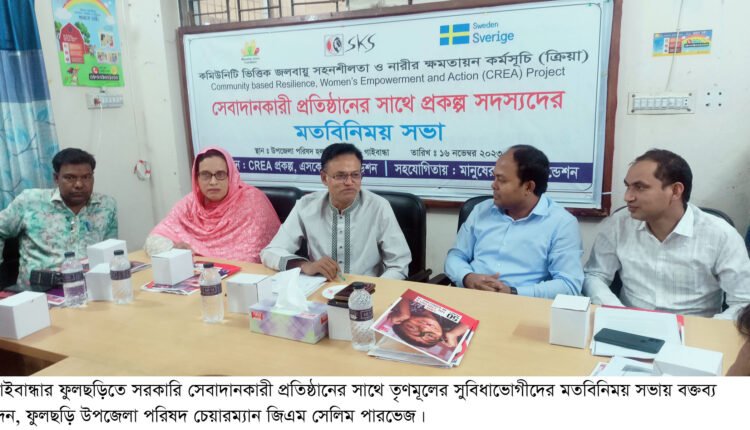 গাইবান্ধার ফুলছড়িতে সরকারি সেবাদানকারী প্রতিষ্ঠানের সাথে তৃণমূলের সুবিধাভোগীদের মতবিনিময় সভা অনুষ্ঠিত হয়েছে। বৃহস্পতিবার সকালে ফুলছড়ি উপজেলা পরিষদ সম্মেল কক্ষে এসকেএস ফাউন্ডেশনের কমিউনিটি ভিত্তিক জলবায়ু সহনশীলতা ও নারীর ক্ষমতায়ন (ক্রিয়া) কর্মসূচির আওতায় মানুষের জন্য ফাউন্ডেশনের সহযোগিতায় উপজেলার সরকারি সেবাদানকারী প্রতিষ্ঠানের সাথে তৃণমূলের সুবিধাভোগীদের এক মতবিনিময় সভা অনুষ্ঠিত হয়। সভায় মাঠ পর্যায়ের কৃষি, প্রাণি সম্পদ, স্বাস্থ্য, বাল্যবিবাহ এবং পারিবারিক সহিংসতার বর্তমান অবস্থা ও এর প্রতিকার নিয়ে আলোচনা করা হয়। উপজেলা নির্বাহী কর্মকর্তা মো. আনিসুর রহমানের সভাপতিত্বে ও এসকেএস ফাউন্ডেশনের ক্রিয়া প্রকল্পের সমন্বয়কারী লাভলী খাতুনের সঞ্চালনায় মতবিনিময় সভায় বক্তব্য দেন, ফুলছড়ি উপজেলা পরিষদের চেয়ারম্যান জিএম সেলিম পারভেজ, উপজেলা মহিলা ভাইস চেয়ারম্যান আঞ্জুমনোয়ারা বেগম মেরী, উপজেলা কৃষি কর্মকর্তা মিন্টু মিয়া, উপজেলা মহিলা বিষয়ক কর্মকর্তা পাপিয়া সুলতানা, উপজেলা সহকারী প্রোগ্রামার কাজল মিয়া, উপজেলা যুব উন্নয়ন কর্মকর্তা তাজুল ইসলাম আলবেরুনী, ওয়ান স্টপ ক্রাইসিস সেল গাইবান্ধার প্রোগ্রাম কর্মকর্তা রুহুল আমিন, ফুলছড়ি থানার এসআই সামিদুল্লা সরকার, ফুলছড়ি ইউপি চেয়ারম্যান আজহারুল হান্নান, ফজলুপুর ইউপি চেয়ারম্যান আনছার আলী মন্ডল, উপ-সহকারী প্রাণীসম্পদ কর্মকর্তা রনজিৎ কুমার কর্মকার, তৃণমূলের সুবিধাভোগী বেলাল হোসেন পলাশ, লাভলী বেগম, আসান মন্ডল, ও আসমা খাতুন।