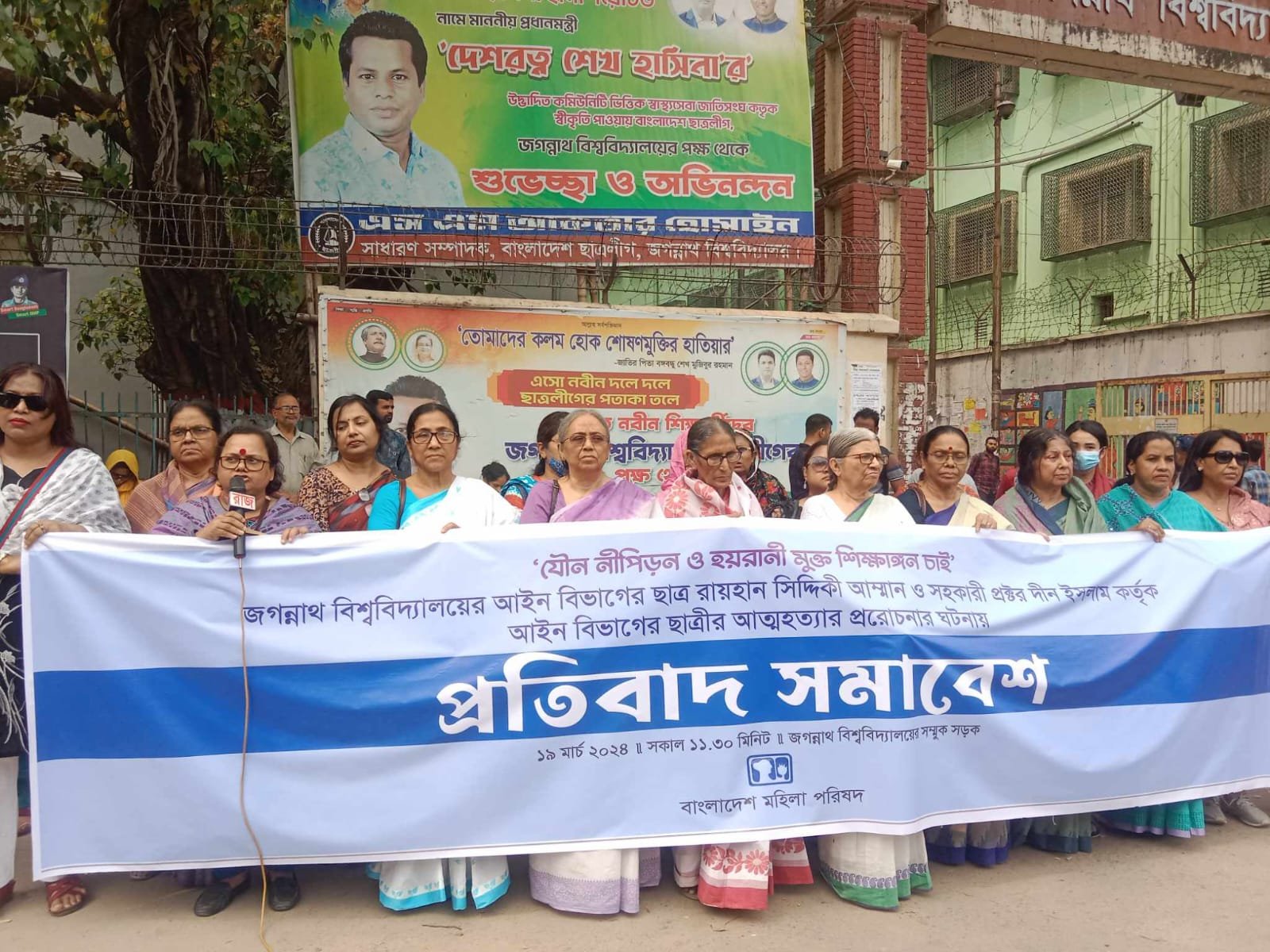 মঙ্গলবার (১৯ মার্চ) জগন্নাথ বিশ্ববিদ্যালয়ের প্রধান ফটকের সামনে এ প্রতিবাদ সমাবেশ করেন তারা। এ প্রতিবাদ সমাবেশের সঙ্গে সংহতি প্রকাশ করে প্রতিবাদে দাঁড়িয়েছিল কর্মজীবী নারীদের ব্যানারে একটি সংগঠনও।